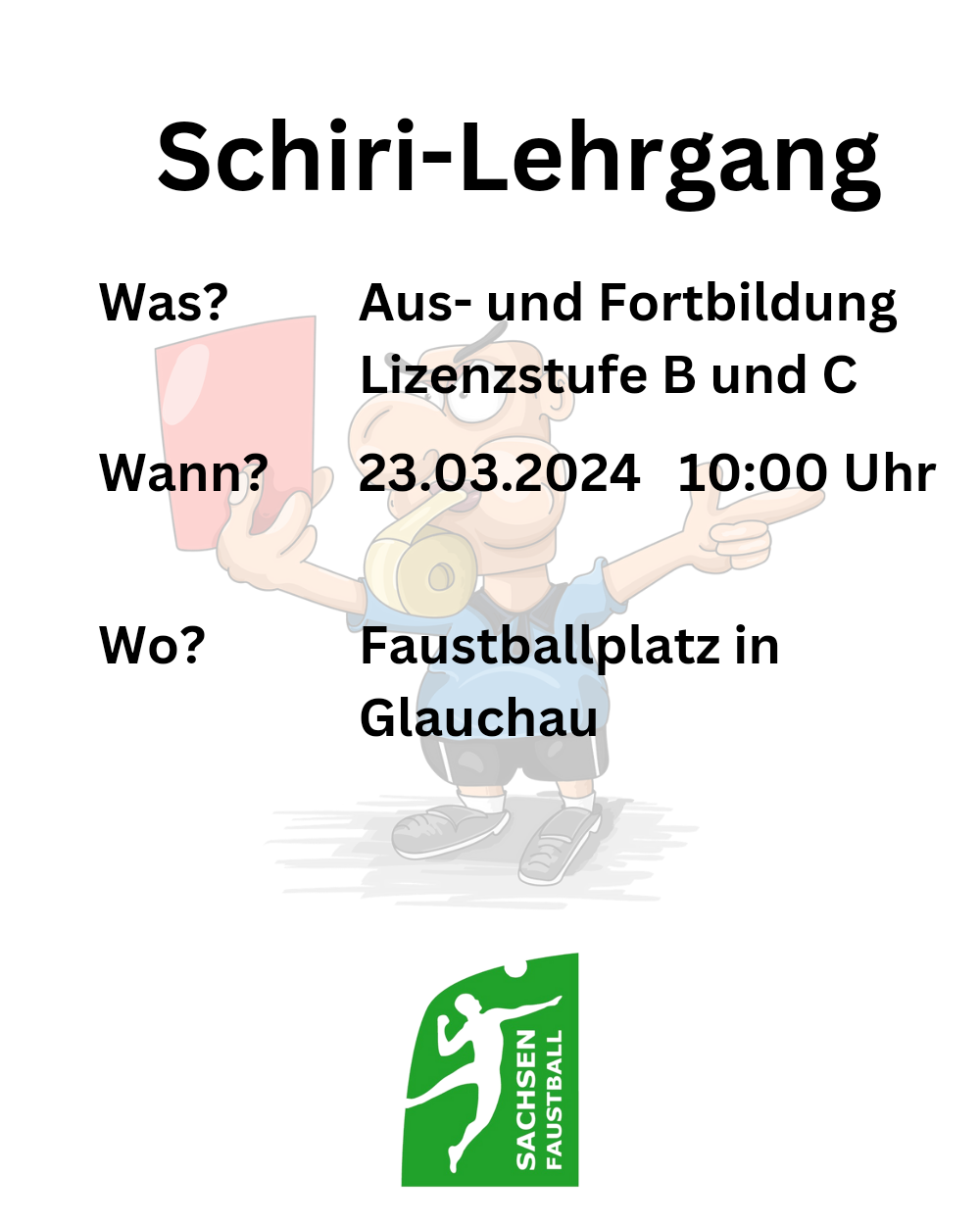 Am 23.03.2024 findet auf dem Faustballplatz in Glauchau ein Schiedsrichterlehrgang (Aus- und Fortbildung Lizenzstufe B und C) statt. Hier findet ihr die Ausschreibung.