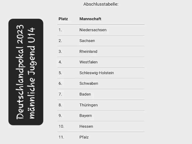 Die sächsische männliche Jugend U18 belegte beim Deutschlandpokal den 7.Platz. In der Vorrunde belegte die Grün-Weißen nach Siegen gegen Thüringen, Hessen und die Pfalz und zwei Niederlagen gegen Niedersachsen und Bayern etwas unglücklich den 4.Platz im der Vorrundengruppe A und verpassten den Endrundeneinzug knapp.