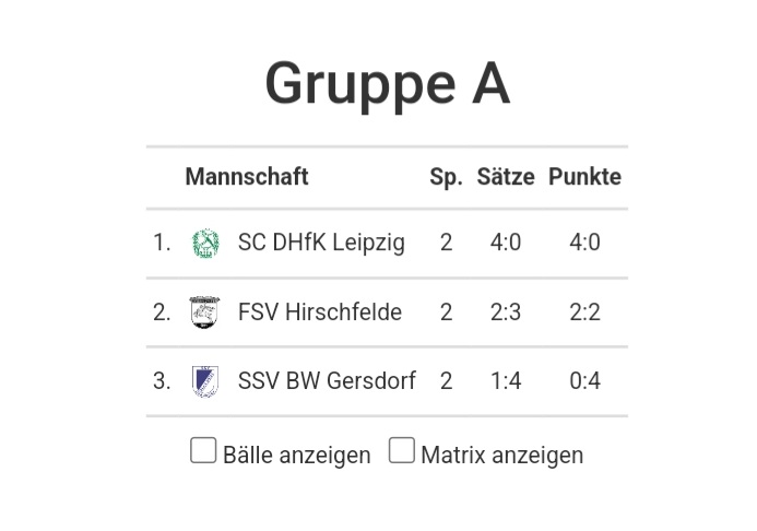 Die Auftaktpartie zwischen dem Gastgeber SSV Blau- Weiß Gersdorf und dem FSV Hirschfelde verlief sehr ausgeglichen und spannend. Am Ende hatten die Jungs von der Neiße mit 12:10; 6:11; 11:9 die Nase vorn. Da der SC DHfK Leipzig I seine Spiele gegen Gersdorf und Hirschfelde deutlich gewann, qualifierten sich Leipzig I und Hirschfelde aus der Gruppe A für das Halbfinale.