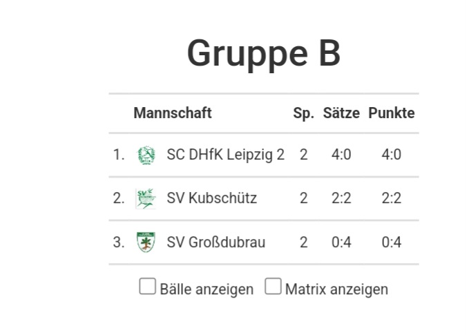 Überraschenderweise gab es in der Gruppe B nur klare Ergebnisse. Leipzig II setzte sich klar vor dem SV Kubschütz und dem SV Großdubrau durch, so dass sich im Halbfinale Leipzig I und Kubschütz sowie Leipzig II und Hirschfelder duellierten.