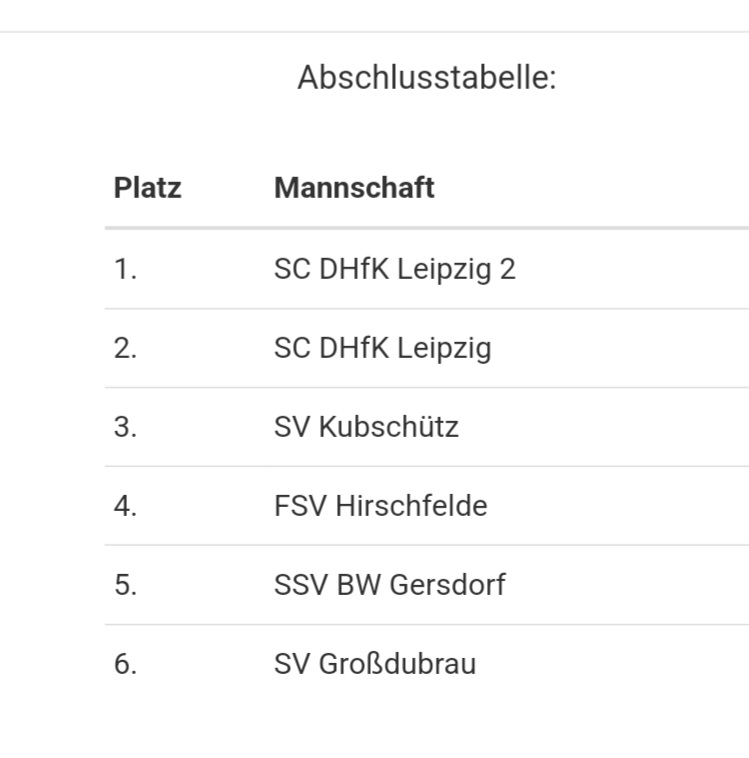 Die Entscheidung über den 5.Platz zwischen Gersdorf und Großdubrau fiel erst im Entscheidungssatz. Letztlich setzten sich die Westsachen mit 11:8; 5:11; 11:5 durch.