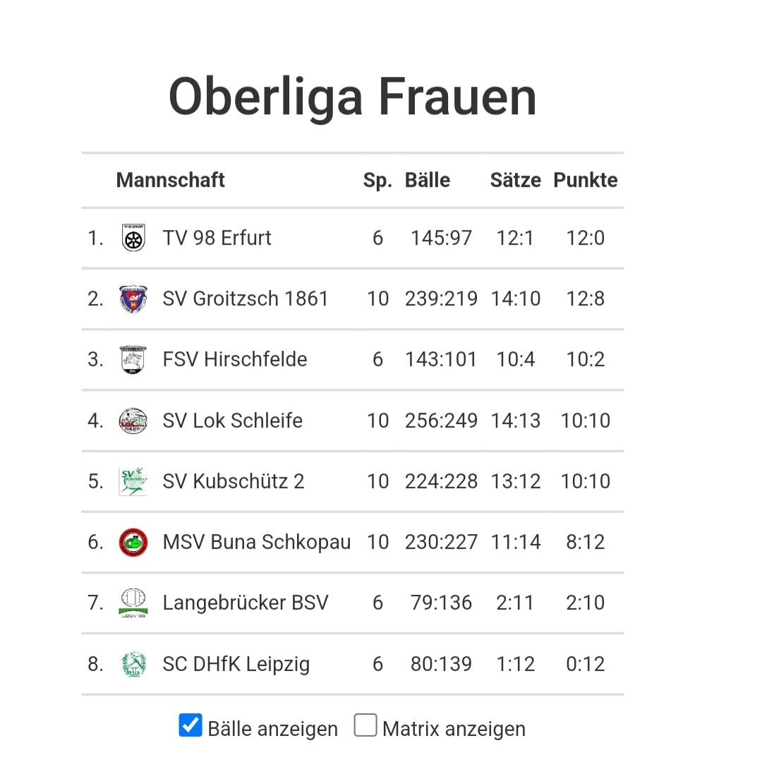 Am Sonntag fand in Schleife der 1.Teil des 3.Oberligaspielrags der Frauen statt. Nach knapp 7 Stunden waren insgesamt 23 Sätze gespielt. Der SV Groitzsch nutze die Gunst der Stunde und setzte sich mit 3 Siegen vorerst auf den 2.Tabellenplatz.